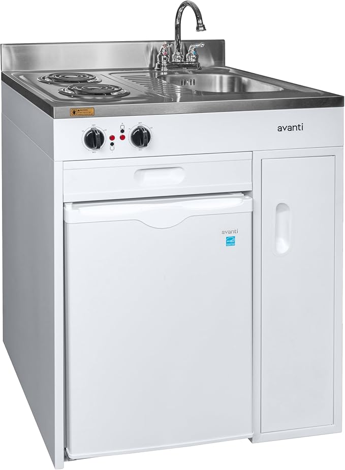 The Avanti CK3016 offers a well-rounded kitchen setup that integrates a cooktop, built-in refrigerator, sink, and storage cabinet within 30 inches. Featuring a